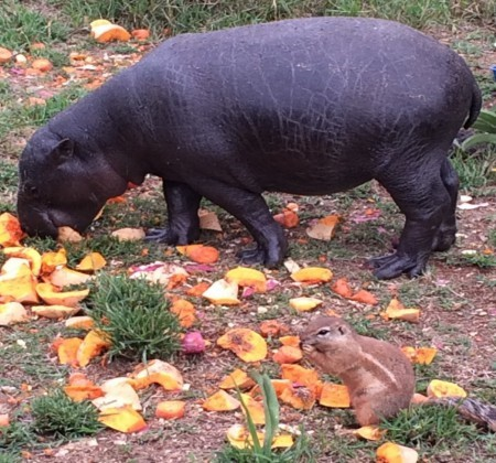 I took this photo at the Rhino and Lion Park in Krugersdorp recently when I took my granddaughter to visit there. Although the hippo is still young, by comparison it is much larger than the older squirrel, which is enjoying a meal about 2 meters from the hippo. What “life lesson” can we surmise from this scenario?